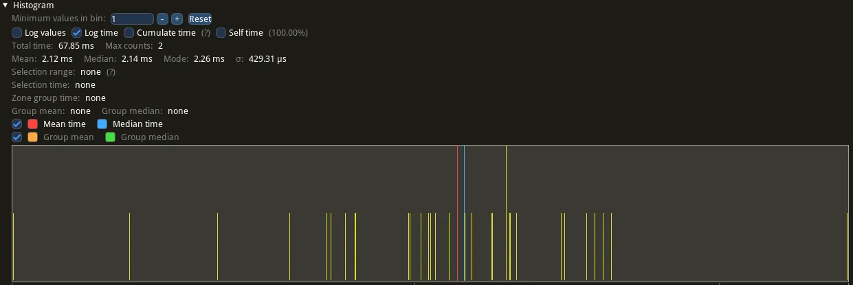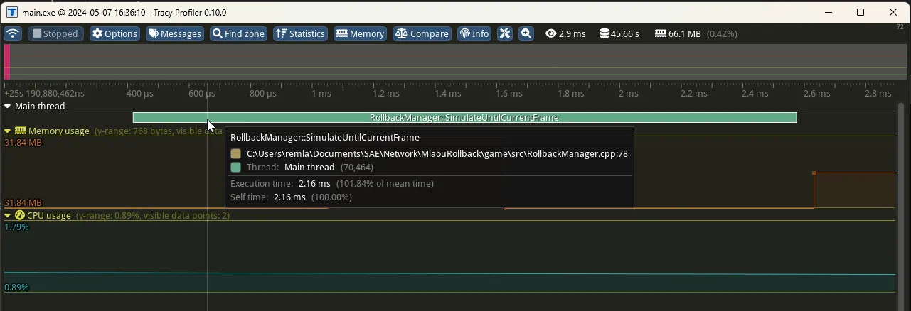 profiling example of the function that resimulates the world, we can see that it already takes 2.16ms which is already quite expensive for a game of this scope.