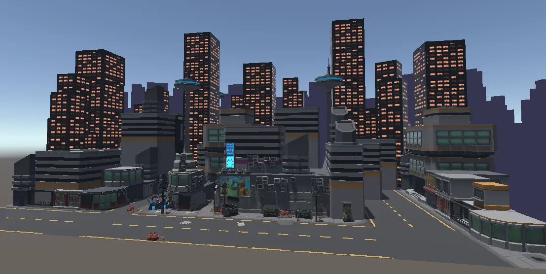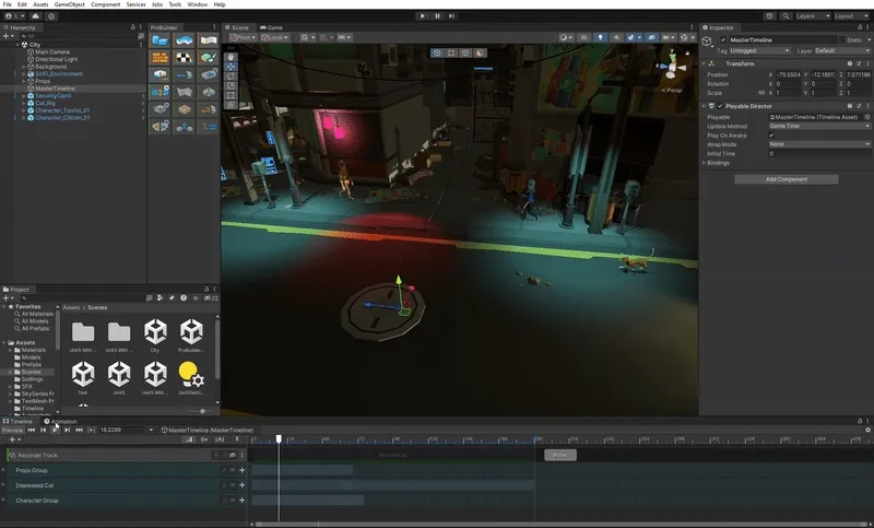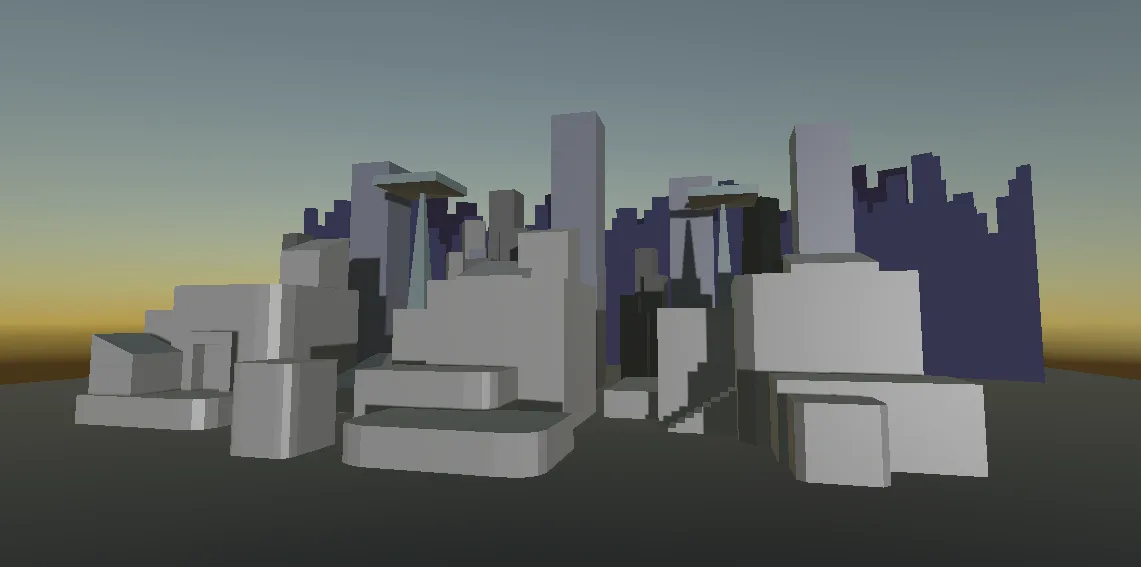 One of the first steps was to use ProBuilder, Unity’s integrated tool for modeling and prototyping, to create a greybox layout of a city. Greyboxing is an essential technique used in early-stage development to visualize the scale and structure of environments before committing to more detailed assets. With ProBuilder, I was able to quickly block out the main structures of the city.