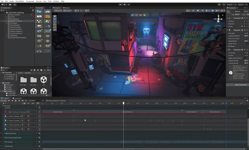 Once the layout and lighting were set, the final step was to bring everything together using Unity’s Film Tools, including the Timeline and Cinemachine cameras. The Timeline system allowed me to arrange and animate different elements in a non-linear fashion, giving me full control over the pacing and sequencing of the film. I could adjust camera movements, character animations, and environmental changes seamlessly, ensuring that the visual narrative flowed smoothly.